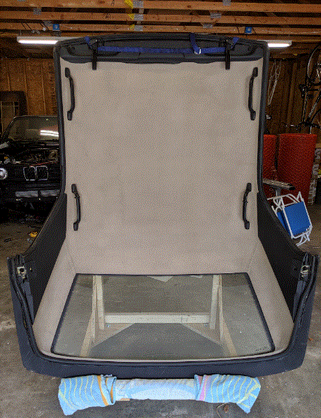 Small tear in vinyl near rear window can be easily repaired...no material missing. Exterior looks really good. Glass has no cracks or chips.