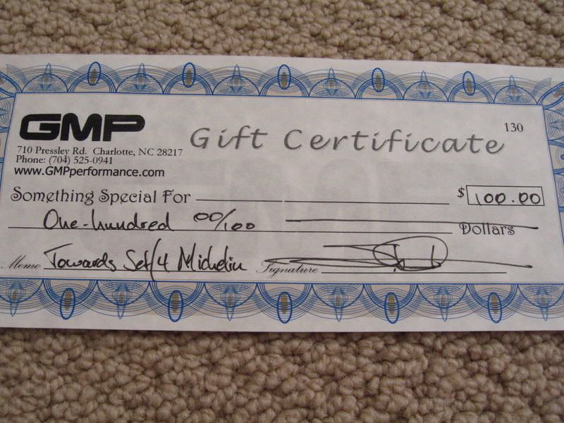 If anyone's planning on buying four Michelin brand tires anytime soon or is looking for a good gift for someone, here's your chance. I won this gift certificate at a Volkswagen event in Charlotte, NC a few years ago at a place called GMP Performance. I have had it lying around for a while and have no use for it because my tires are in good shape and I'll throw some Potenzas on there later on. This would only work for someone who is willing to go to GMP directly and order the tires, which is why I'm selling it for $70 (shiping/postage is on the house.)
