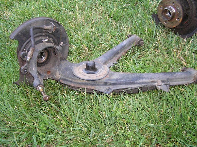 Driver’s trailing arm, ABS car, bearing and hub installed, $30