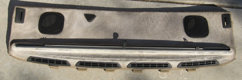Carpeted, tan, early model rear parcel shelf with integrated full width window shade, in good condition, shade rolls and retracts fine. The rear shelf has Not been cut for aftermarket speakers and it has all plastic vents and covers. Comes with mounting clips and only blemish is one small clip on the blind is broken.
