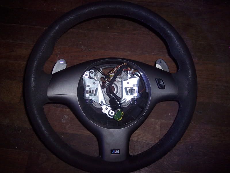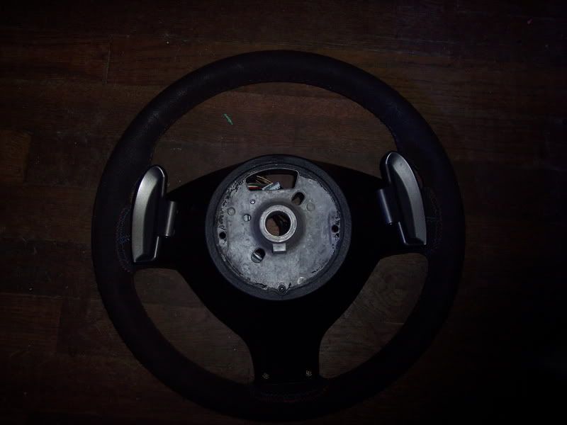 Alright, for sale I have an E46 M3 Alcantara Steering wheel. It comes with the paddle shifters, as well. I believe it is from the competition package, since it only has the one button on it. Im not sure if all Alcantara or M3 steering wheels have the blue, purple and red stitching, as far as E46 goes, but this does. Its in great shape, and DOES NOT include the airbag.