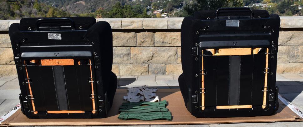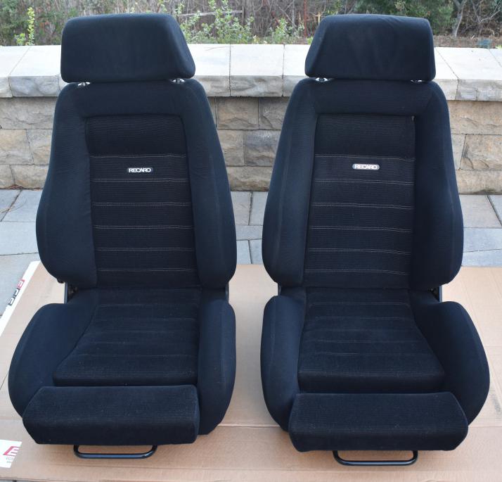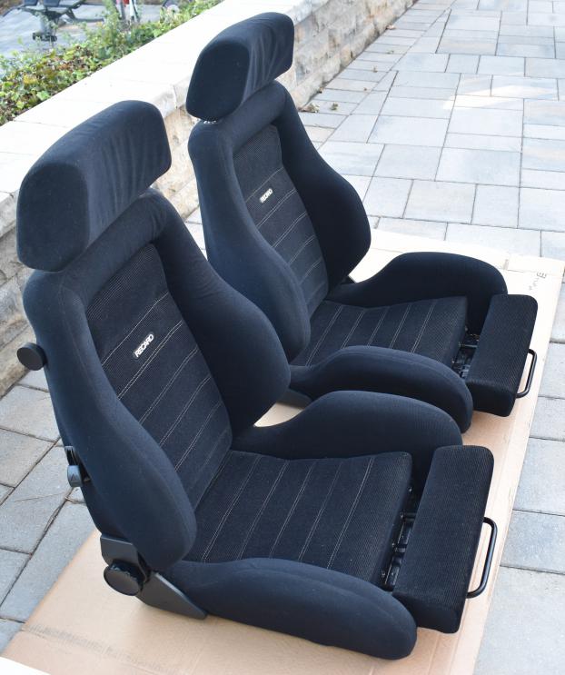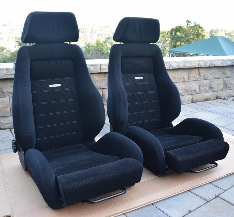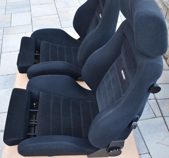 Idealsitz LS with C leg extension. Pair of original fabric black corduroy exceptional condition. All adjustments work perfectly seat recline, leg extension, shoulder pads, and headrest adjust quick fold lever for backseat access. One piece custom bottom support (like newer models for better comfort/support) additional and original straps also included. No rails or brackets included.