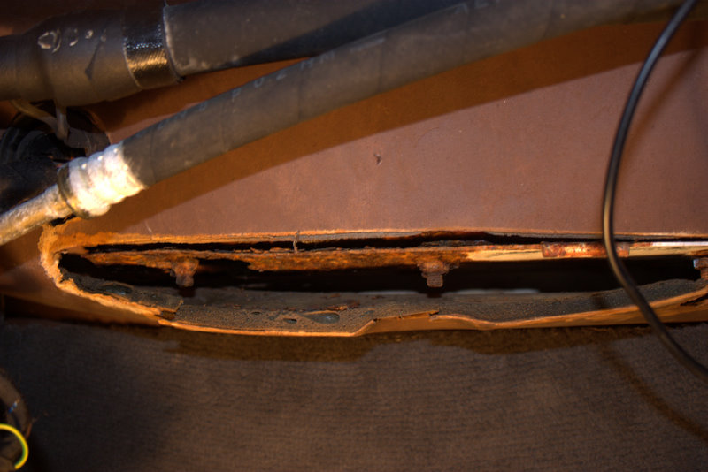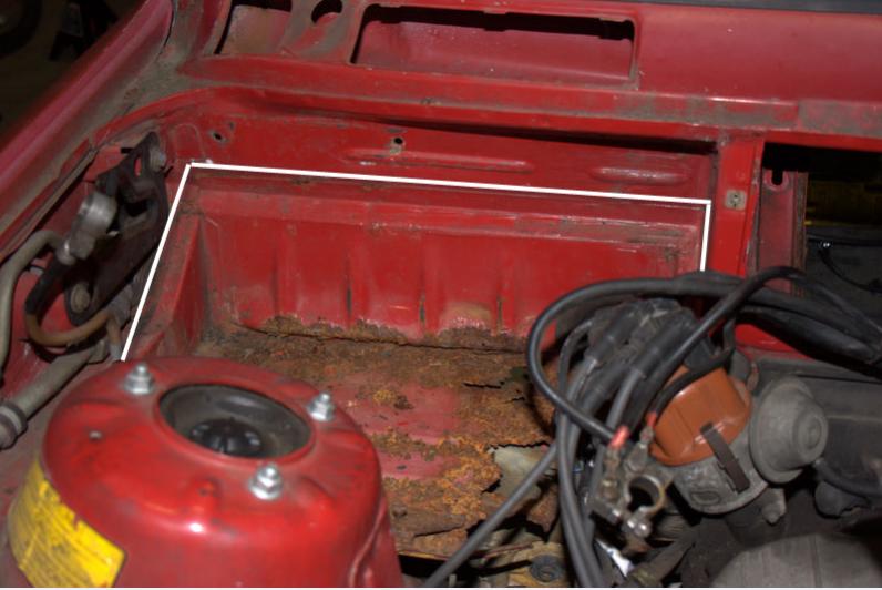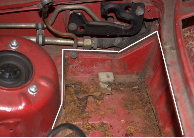 Here are some pictures showing what I need, I've outlined it in white in a couple of pictures. In the last pic you can see where the rust is affecting the mount for the glove box. The hinge disintegrated when I disassembled it. I haven't gotten everything completely apart yet but it looks like the glove box mount is integrated into the back of the battery tray, can anyone confirm? I need the glove box hinge/nuts as well.