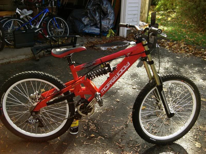 I have my loved Morewood Izimu up for sale. I've had it for about 2 1/2 years, but it's probably only seen 15 days on the trails (7 of DH). It has been mechanic owned for most of it's life. The frame was repainted and re-stickered in 2006 to match the Morewood team colors. Fork has the Boxxer team lowers on it, but is indeed a WC. It had it's oil changed a year ago, but has been ridden twice since and it is missing the rebound knob. Tires are brand new with a half day of DH on them. The wheels are in near mint condition. Bars are a little scratched. Derailleur, shifter, chainguide, bottom bracket, and wheels were bought new in summer of 2006. Brakes were used when put on. rear was rebuilt in 2007, and front was rebuilt 3 months ago. The rear shock was rebuilt and set for someone 165lbs at Avalanche here in CT. Hands down the best shocks out there. I am including the ti spring I have for it as well(which costs $230 alone and the shock is $550). It was just too stiff for me. I will also include a custom made Ti rear axle, a spare front wheel/tire, and any spare parts that go along with the bike.