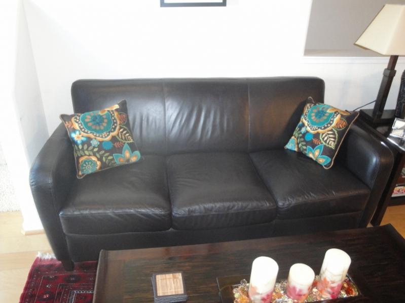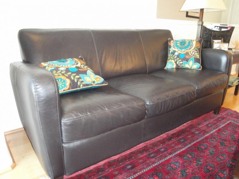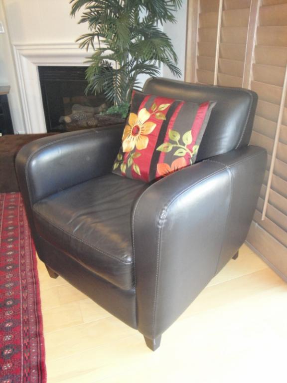 I have a Pier 1 leather three person couch and side chair in an attractive chocolate brown color. They both are in good condition and have minor wear due to usage. I'd give the couch 8.0 out of 10 rating and the side chair a 9.0. The cushions are still firm and both pieces of furniture still have a lot of life in them. They are modern/urban and ideal for smaller livingrooms such as apartments. Price is $700.00 OBO. Thanks