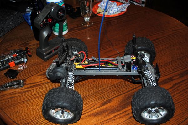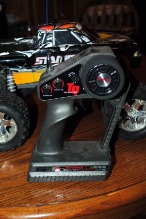 Up for sale is my traxxas stampede electric r/c truck. It is a well used truck but it all works just fine. I just replaced a broen steering servo with a new waterproof one from traxxas. This however does not mean the entire truck is waterproof. You need to spend about $100 more to make it ready to run in wet conditions. Comes with 7.2 volt 3000 mah battery and the standard traxxas battery charger. Remote control, with batteries as well. It is a ready to run truck, with no problems. Has the standard brushed titan 12t motor. Over all the truck is a stock truck, with the exception of the waterproof servo and some metal gears in the motor that were previously plastic (that i shredded, hence the replacement.)*I believe its supposed to get to 25 mph but I have no clue. For a stock inexpensive truck I think its pretty fast