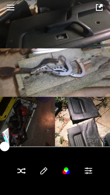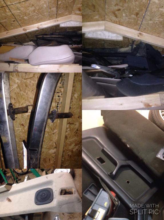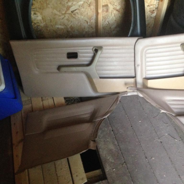 I have a dark blue interior and a tan one no front seats . Tan carpet .also have 2 doors complete right and left . Front and back bumper . Side windows left and right . Some exterior parts.. The shock mounts for the front