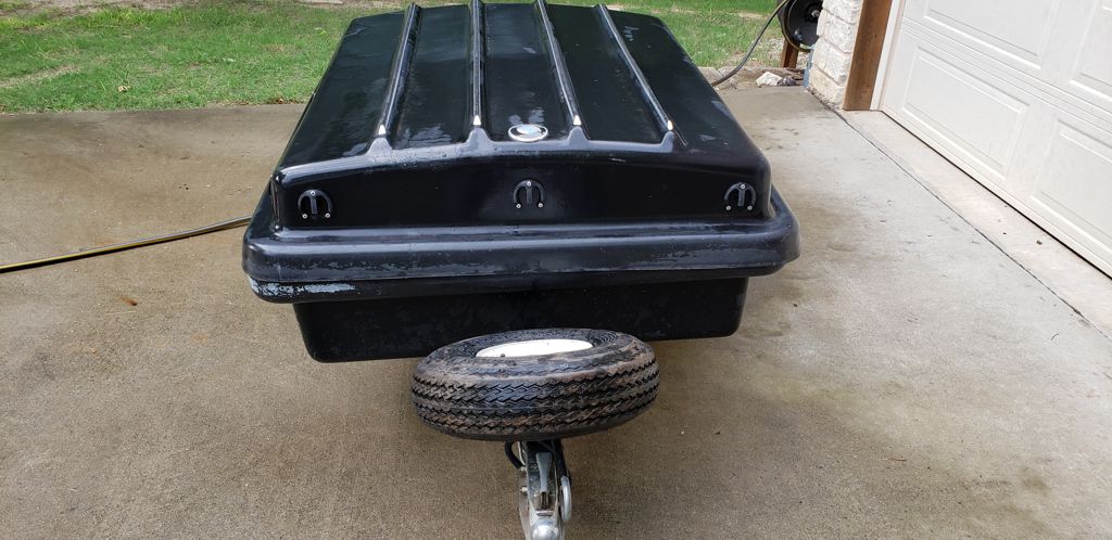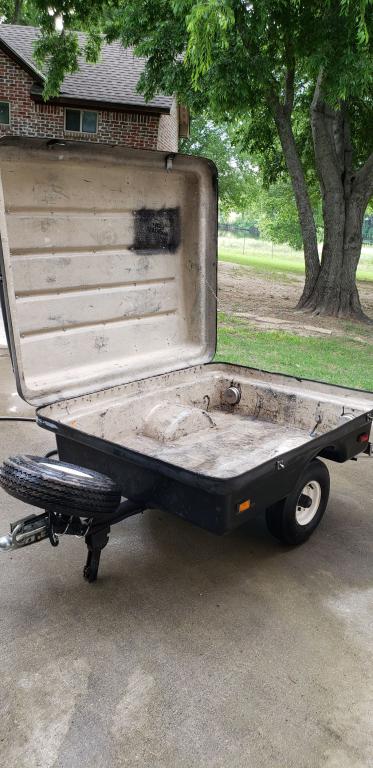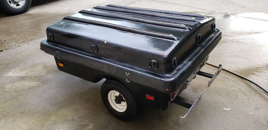 1970ish Clamshell Trailer with chrome bumpers. Manufacturer unknown. Lightweight fiberglass body is 24"H x 48"W x 60". Title in hand. 8" wheels with high-speed 5.70-8 Tires. Has brand new spare and holder. I started out using this as a track trailer for my BMW E30 track wheels (4) and compact floor jack. It is very useful for camping as well. We were able to fit a large, loaded 120-quart marine cooler inside, 3 milk crates full of camping gear, tents, stove, etc. It has tie-down hooks around the perimeter of the lid so you can use a bungee net on top like we did. Has 2 hasp flip locks on the side for security. 1-3/4" hitch tongue with 4-blade connector. There is a crack in the fiberglass inside near the frame. It's not pretty but it works great nonetheless. You can easily maneuver it around by the handle and tilt it up against a wall or structure. I have the title.