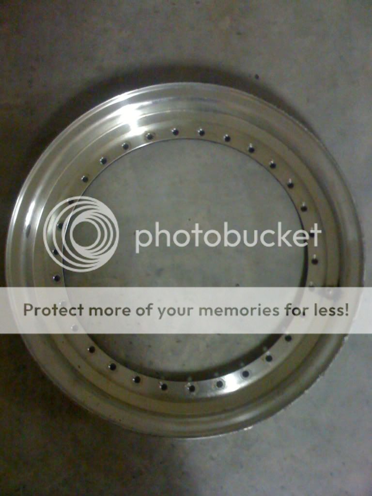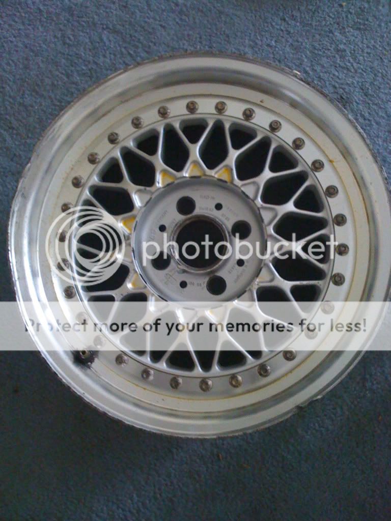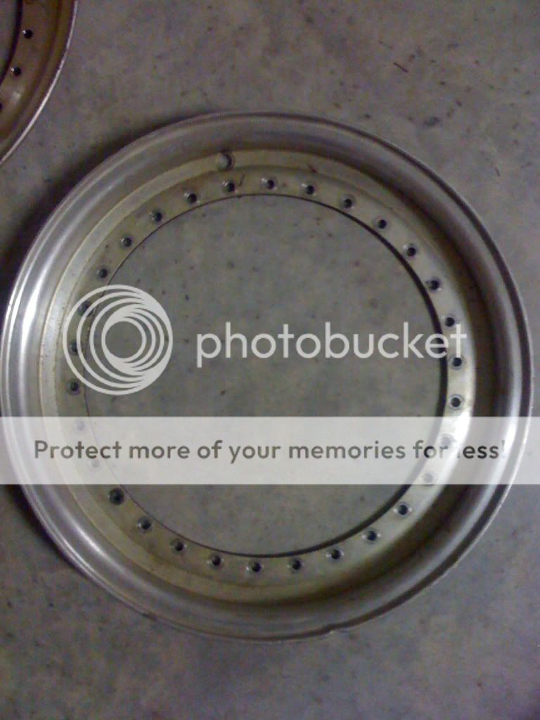 The wheels were freshly powercoated about 3 weeks ago, and I have not put them together because I do not have any gold bolts to put on. They are not put together. What I am missing are the bolt, 1 center ring, and 2 caps. I was going to run them capless. I am also interested in trades for other wheels that are multi-piece for a BMW 2002.