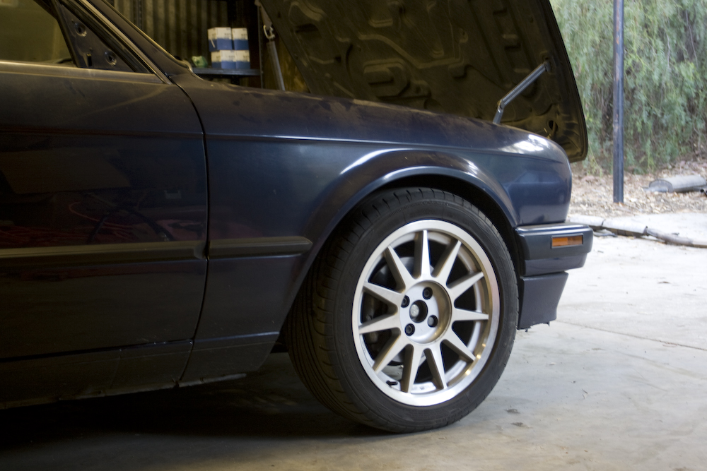 Here are some Hartge Replicas that are in great condition. The size is 16x6.5. I do not know the offset but i hope the pictures can give you an idea. There is practically no damage except a very small nick on the 4th wheel. The face of the spokes and the lip have a polished finish that is getting a little faded but it is hard to notice, in person, and these wheels still clean up very well. The pictures make the negative aspects of the finish really pop, expect better in person, not worse. The tires are Goodyear Eagle f1's 205/50's with about 35-45% life left.