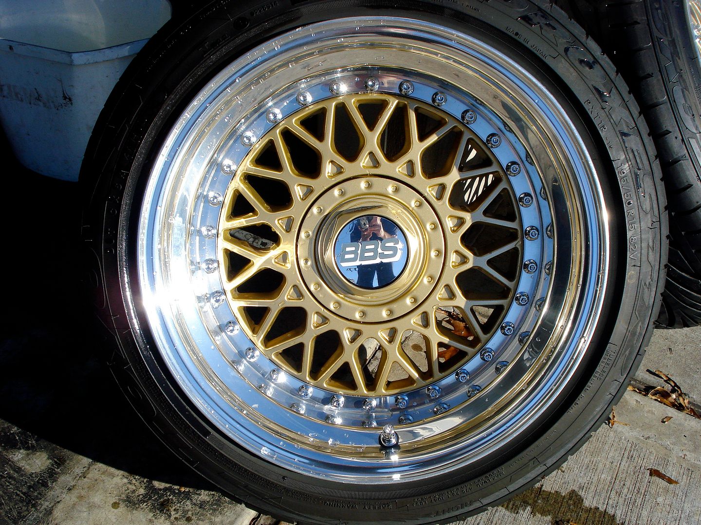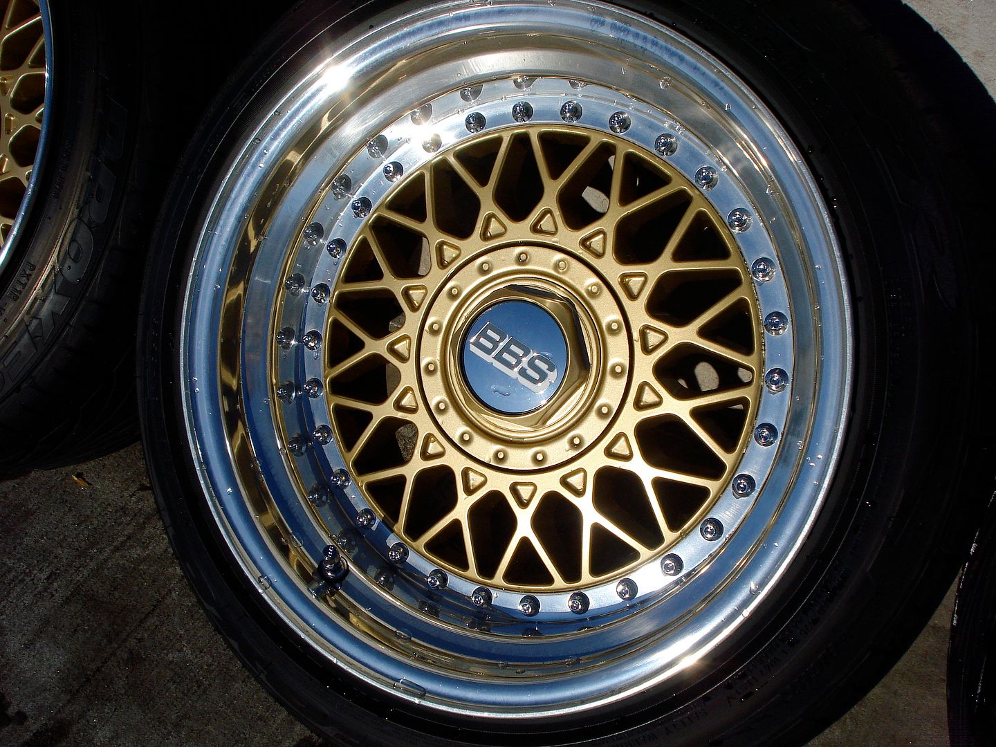 (4) 15x9, et1 RM, originally 15x6.5 et33. Repainted BBS gold with 3" polished lips and chrome bolts. Chrome BBS caps. BBS valve stem caps. Tires are 195/50/15 Toyo T1-R. One wheel had slight curbage but I sanded it down and repolished it, can't tell unless you're looking for it. I'll get a pic up soon of that wheel.