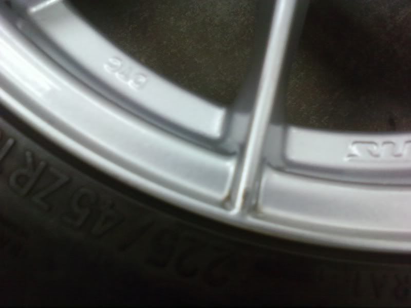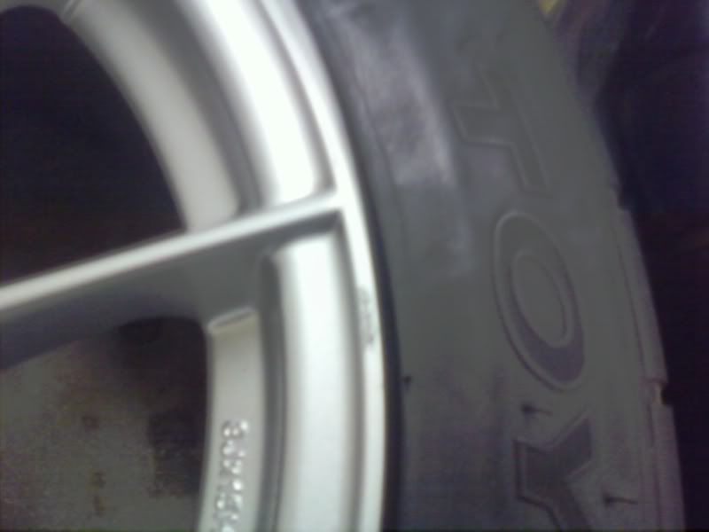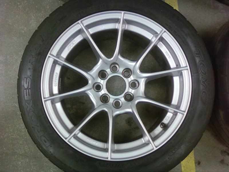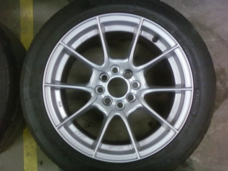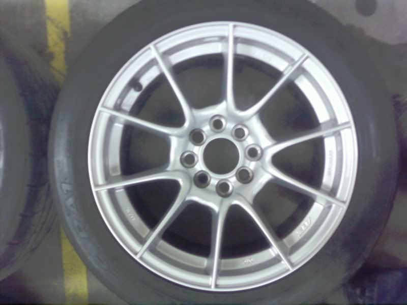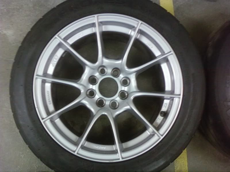 Currently have 225/45-15 RA1's mounted. I will have them removed prior to shipping. Unless you want them. They are not very good, and I believe one might have a nail. No curb rash, only some slight pitting here and there. Residual brake dust, as well. That should come off. I only used a towel and some cleaner.