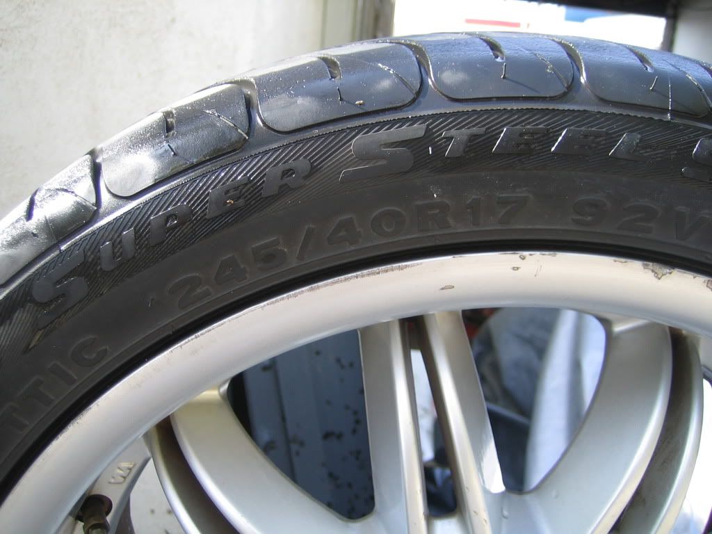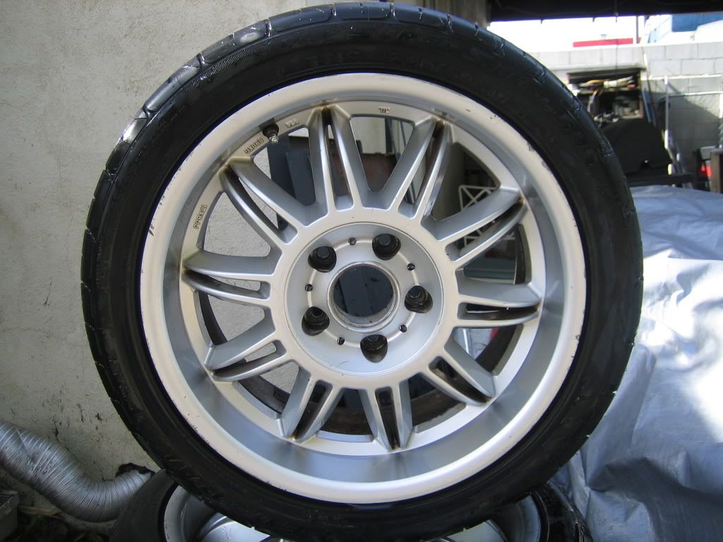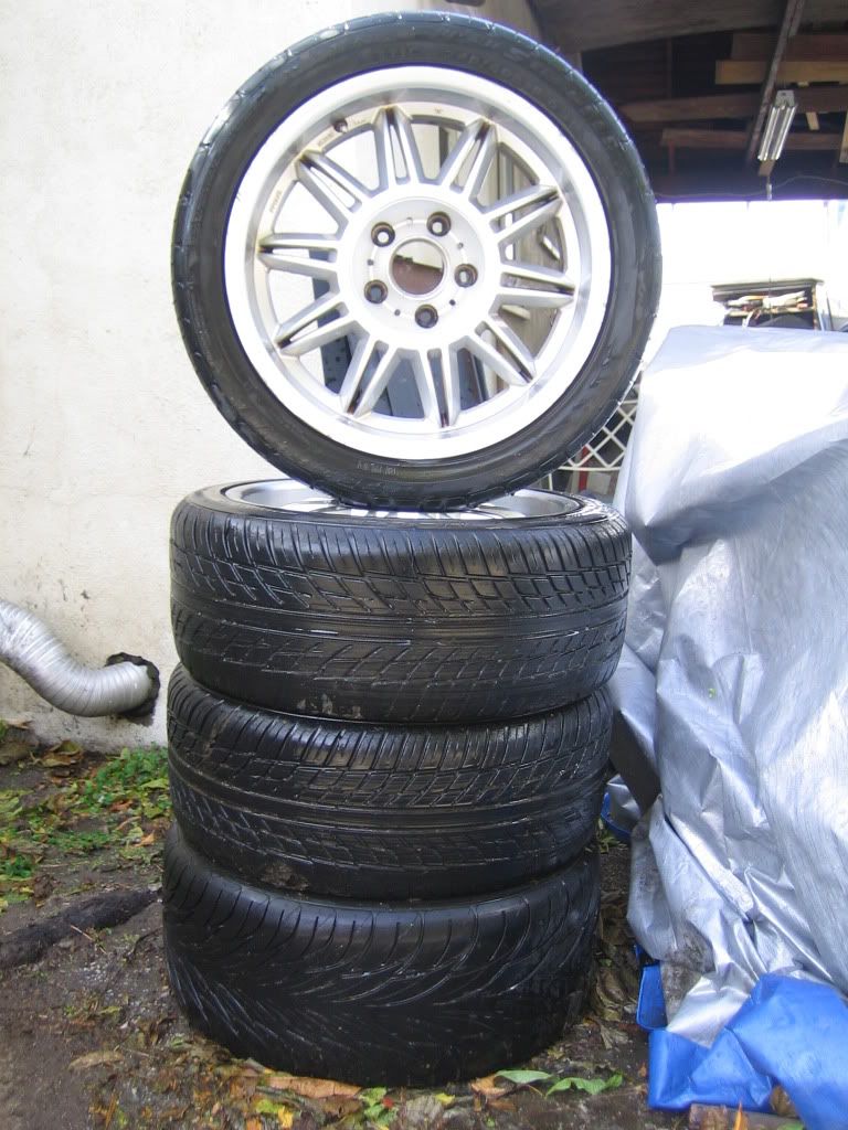 Two rims have almost new Federal 595 tires on them 245-40-17 and the other two have almost new no name 235-40-17 tires.