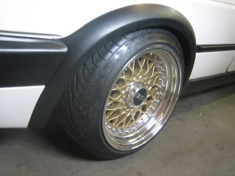 They are 15x8 et13 up front and 15x8.5 et06 in the rear wrapped with Toyo 195/45/15s. The centers & barrels were powder coated Gold, mirror polished Kodiak stepped lips all the way around and the BBS logo caps are brand new.