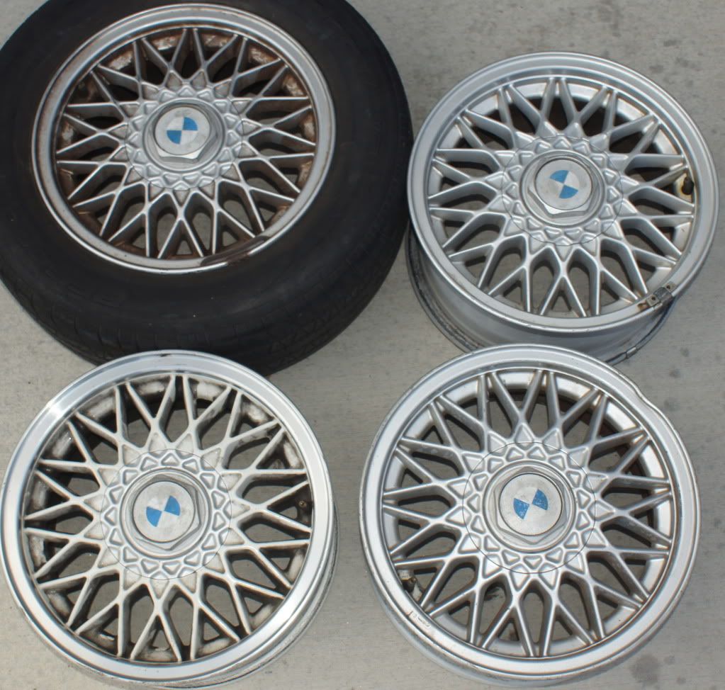 I'm cleaning out my storage so i have these for sale for $150 plus shipping.The wheel on the lower left has a minor lip bend but still holds air and is easily fixable. I know that the pic shows a white m-tech BBS but I actually have 4 silver and one white one.