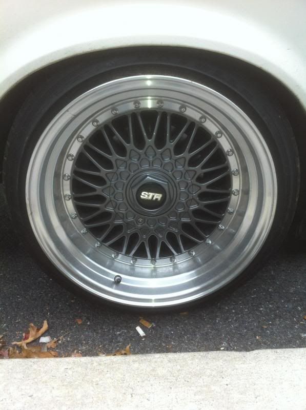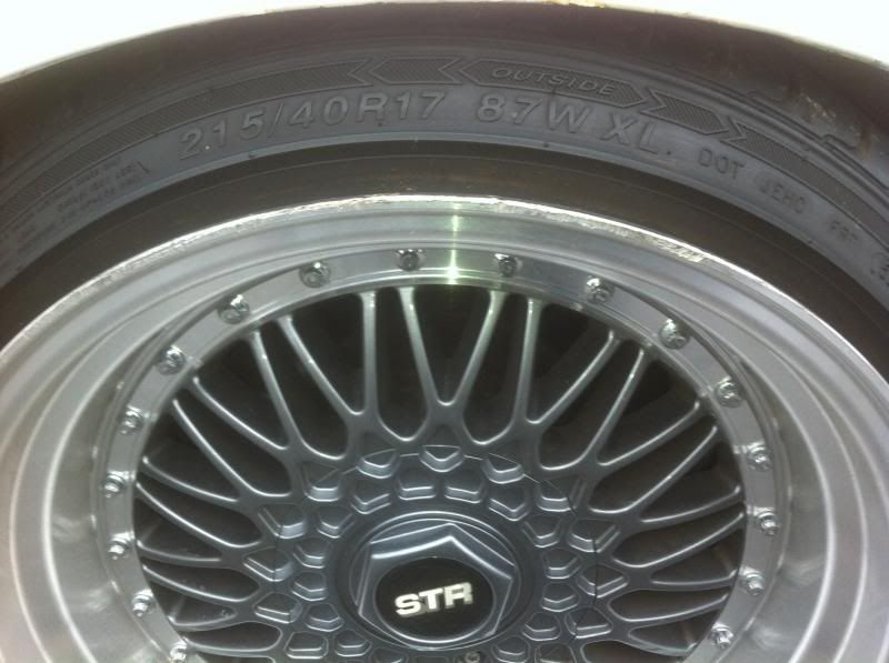 The wheels are str rs reps. 17x8.5 and 17x10. The fronts are et 30 and the rears et 20. There are 25mm spacers in the front and 15mm in the rear to make it et 5 squared. The tires are Rotalla radial f107's front and back. The fronts have 205/40's and the rears are 215/40's. Minor curb marks on the driver side wheels. You get wheels, tires, spacers, and hub rings. Everything was bought in April. Tires are basically new still.