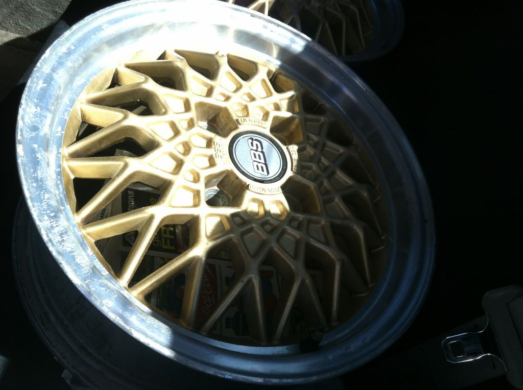 I have a set of 5 BBS RA 14x7 4x100 wheels. Not sure offset still havent looked for it yet, if anyone knows off hand thatd be great. Gold centers, with polished/cleared lips. Could use a good refinishing, have some clear coat peeling and few chips here and there. Looking to get $420 OBO for the set of 5 plus shipping no tires.