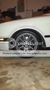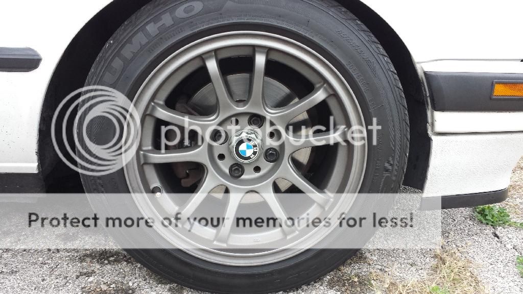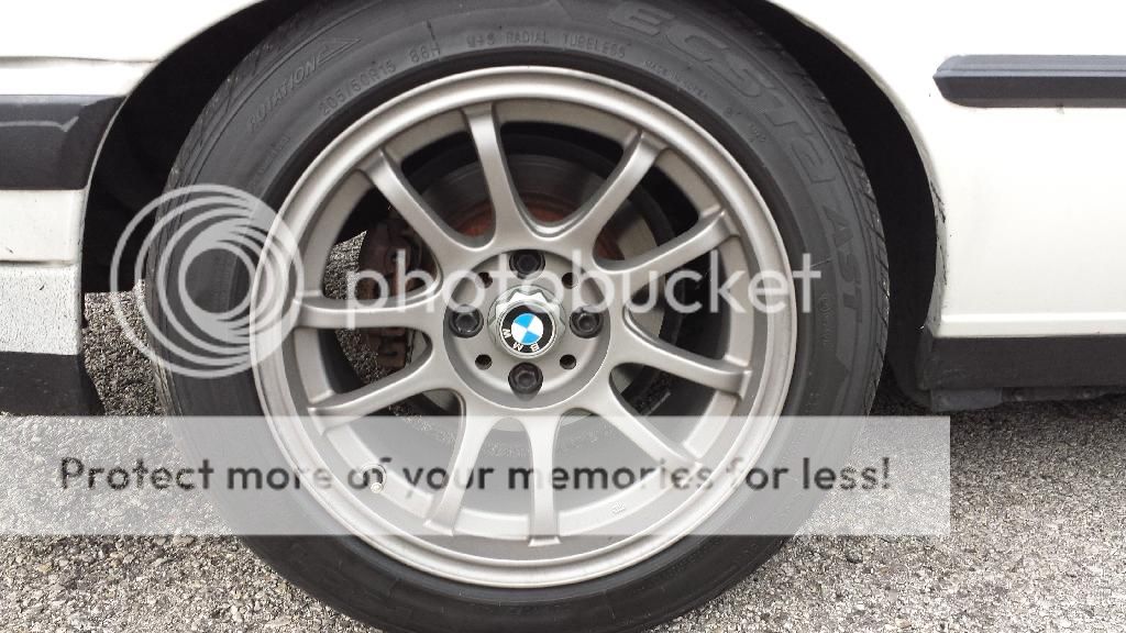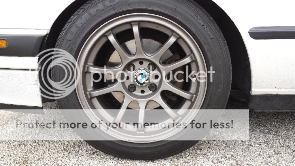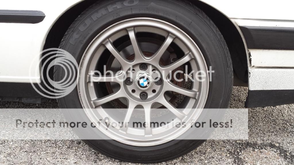 I got some new wheels today so I am going to sell these to offset some of the tire expense. 15x8 4x100 and if I recall correctly the offset is et20. Correct me if I am wrong. I bought these wheels a little less than a year ago. There is no curb rash on any of them. The tires are kumho ecsta ast 205 50 15. No fender roll was required. The front two have about 60 percent tread life left, the left rear about 50 percent and the right rear is worn almost to the wear bars, it's a little above. I will get exact measurements tomorrow. The rears also have some camber wear.