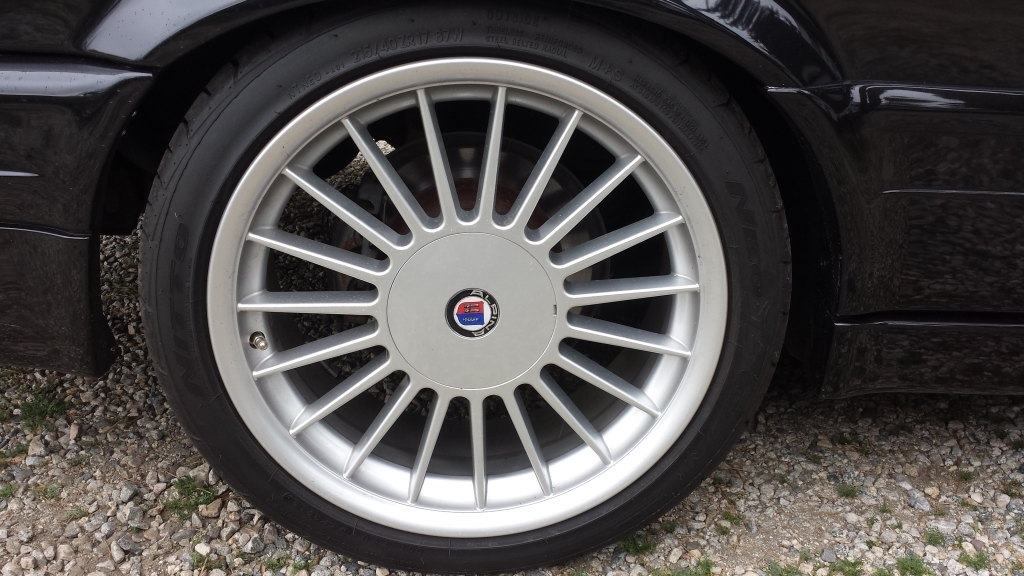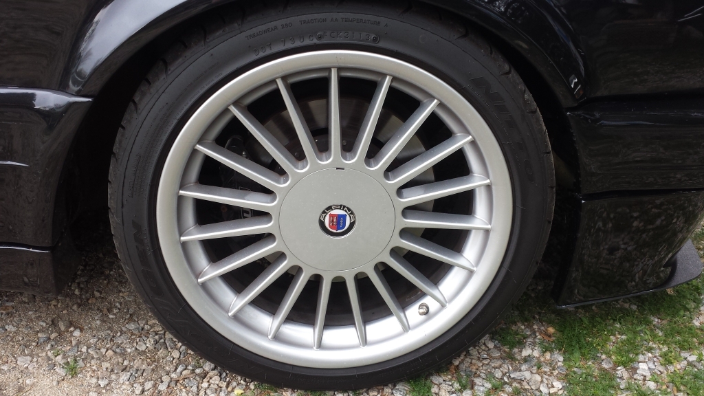 I really hate to do this, you have no idea, but I am listing for sale my Kopi Alpina wheels and tires. These wheels are just over a year old and in mint condition. I apologize though, I did not clean them for the photos. These are no longer available with only a chance of being reproduced months down the road. The tires are in practically new condition as well. I don't have a mileage estimate but it's very low. I rarely drive the car. These are direct fit to the E30 and really give it a classic look. I've had two sets of these and just love them but I've found a set of wheels I can't pass up so I've got to let them go.