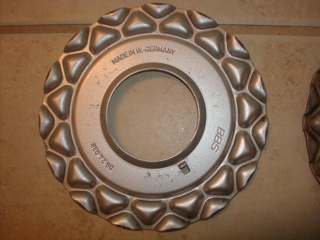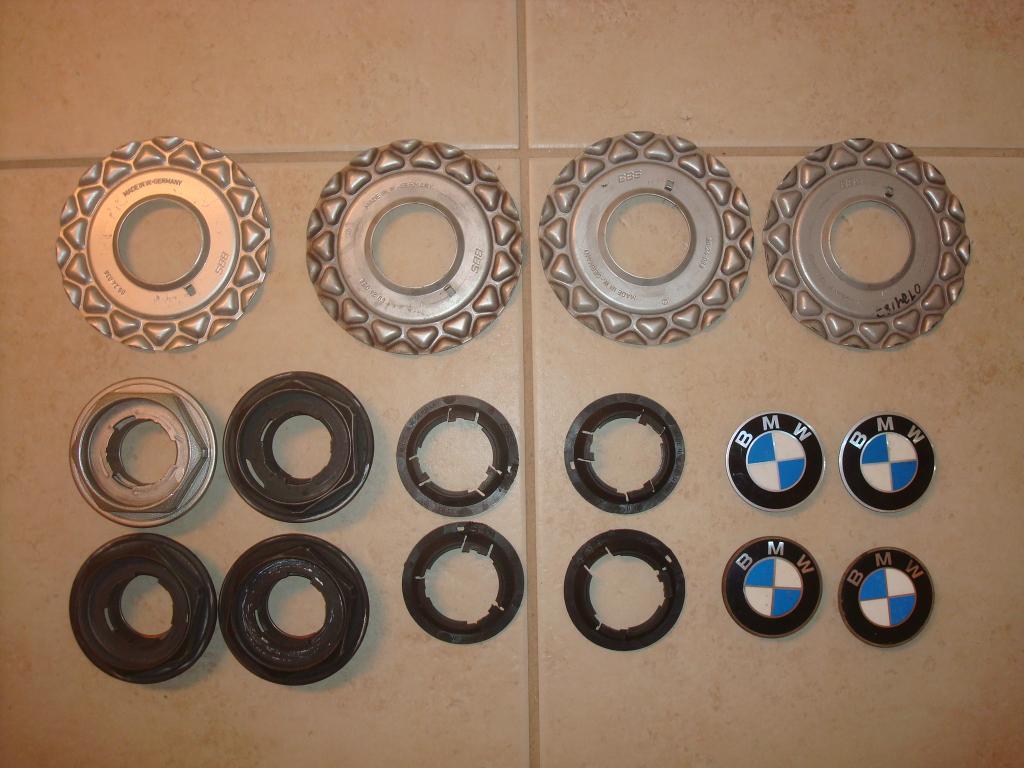 I have four center caps for BBS basketweave wheels (14"). They are disassembled and ready for assembly. One of the black plastic pieces (bottom right one in picture) has a tab broken and is cracked. Everything else is good, just needs to be cleaned up. BMW logos look good. $65 shipped or will trade for a nice condition battery cover that will fit 1990 325is.