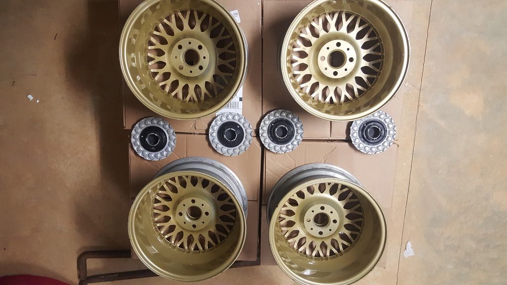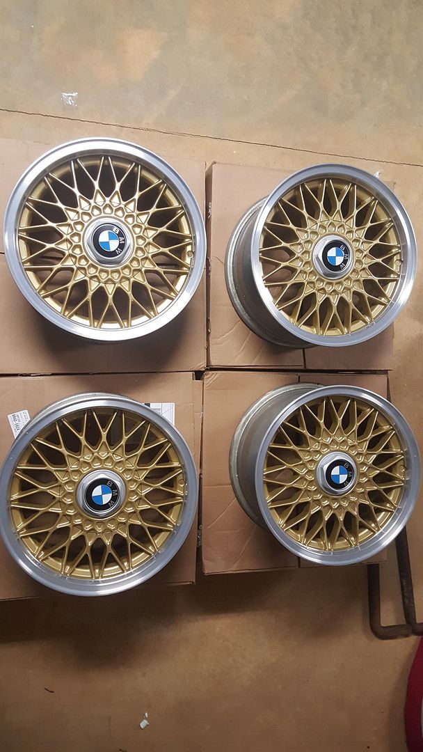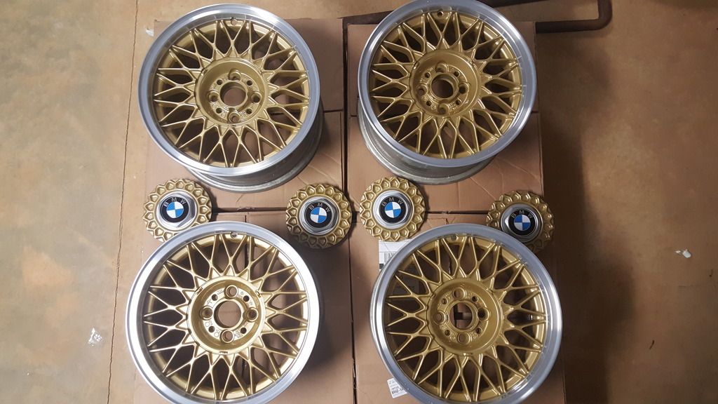 I have a set of 15x7 et24 euroweaves that were just professionally refinished by Wheel Collision Center in Bath PA. They ensured they were perfectly round, straightend one tiny bend in one of the lips and fixed all curb rash. They did a phenomenal job and they turned out perfectly! Gold center with machined lips followed by clear. The only part that wasn't refreshed was the center cap locking nuts. I was saving these for when I finished my e30 but plans are changing. Please pm me if you have any questions!