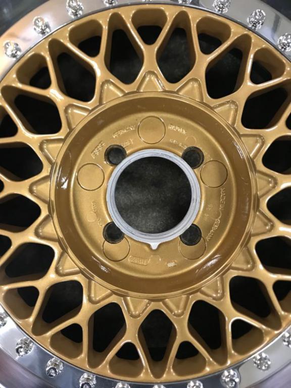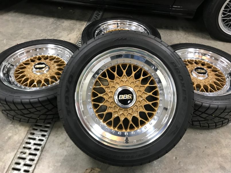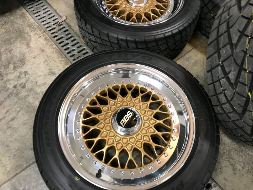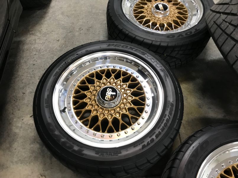 For sale is a set of 16x7 et17 BBS RS Wheels built for me by Paul Ehrlich at Ehrlich Wheel Works. Built last winter and used for less than 300 miles. Powder coated gold centers with new polished lips, new black barrels, and new chrome bolts. Plugged and re-drilled to 4x100. Also included are custom machined hub centric wheel spacers in 8mm front and 5mm rear. Tires are Toyo Proxes R1R in 205/50-16. Tires are less than 300 mile also. $2750.00