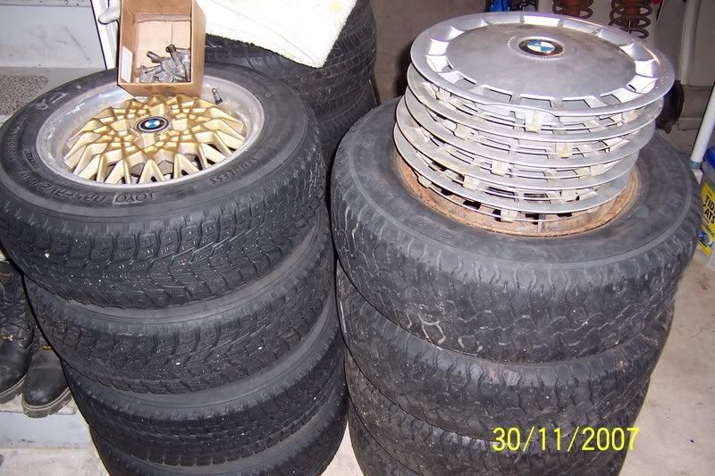 On the right, another old school winter set. 4 rusty steelies, with 4 worn out Gislaveds mounted, but with 5 hubcaps, yes 5. $75 picked up.