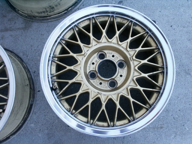 Set of 15" euro BBS RZ one piece gold mesh/crosspoke wheels for sale. Wheels are in great condition with nice gold paint, polished lips and NO rash. 15 X 7, ET 25. NO caps. Great looking E30 wheels with perfect fit.