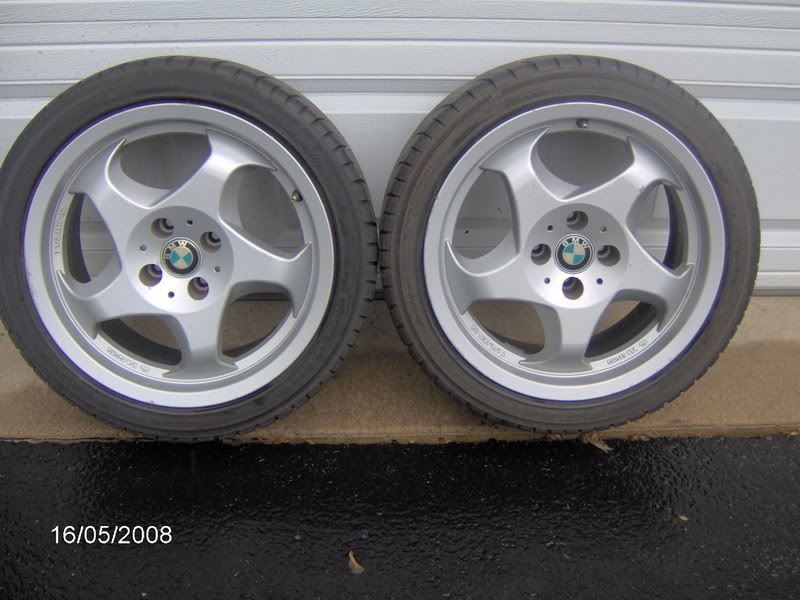 I am selling two 16x7.5 M-Contour replicas. They came on the rear of my m42 when I bought it. They're in pretty good condition with only very minor curbage on both. Light sanding and paint would hide it. The tires are Yokohama 215/40R16 with just a minimal bit of life left in them.