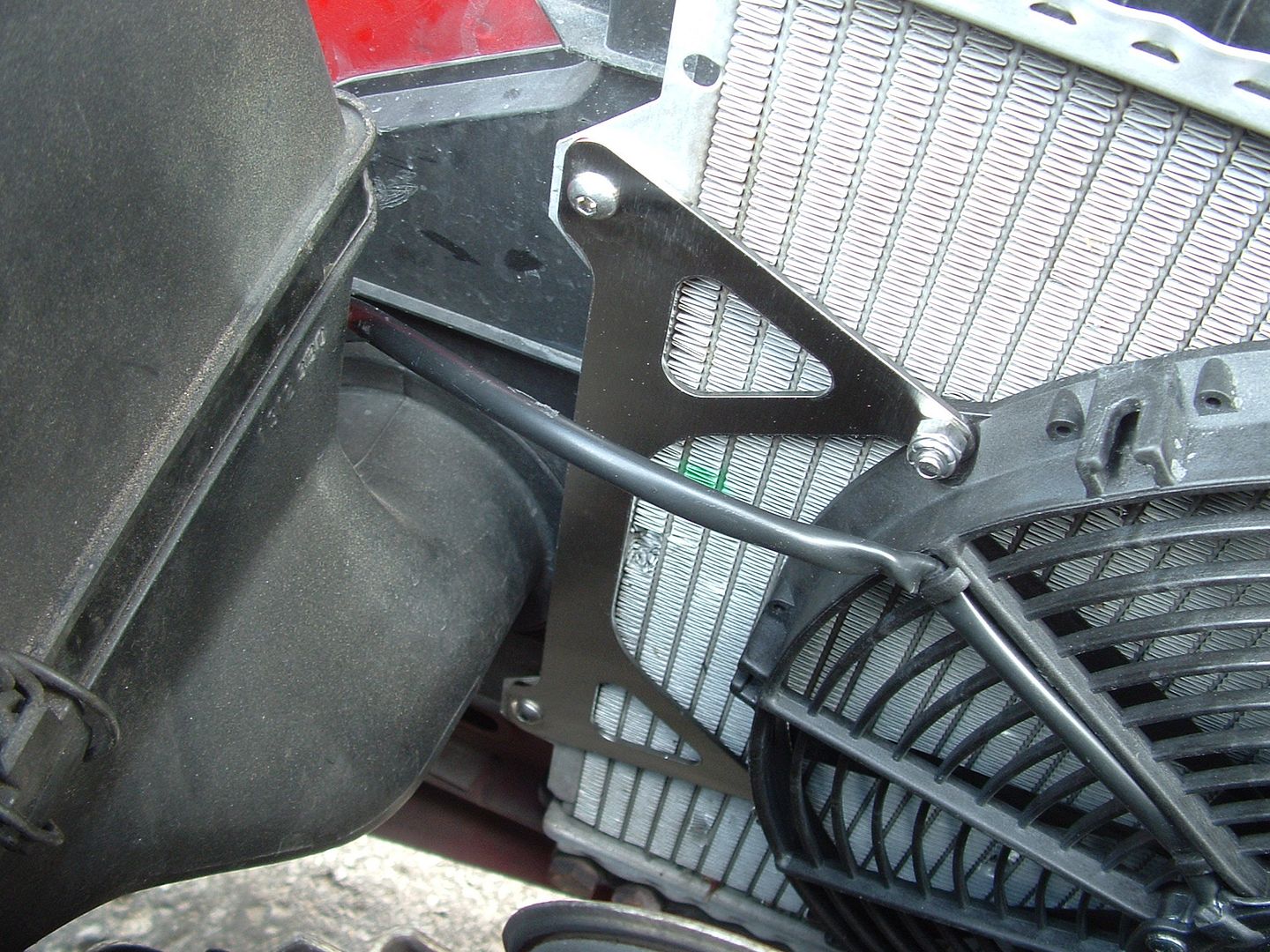How to install the brackets on the radiator. Note that the brackets are located behind the fan, not between the fan and the radiator. It allows for a much smaller gap between fan and rad, and it also reduces the area of the core that is blocked by the brackets. The stainless steel bolts have a shallow domed head for improved clearance.