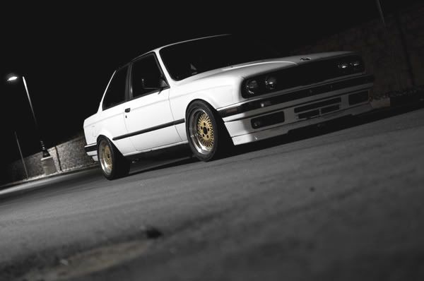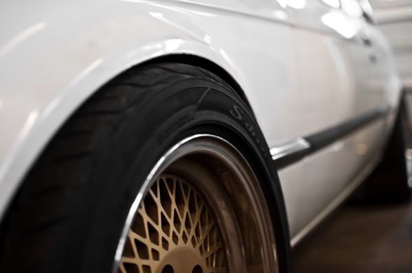 the front wheels poke out of the fenders, and the fender is sitting down on the tread block. if you were to run 18mm design 2 4x100 > 5x120 adapters on these wheels you'd be at 7 et2, which on an e30 with stock 4-lug would be around 10-15mm further in than this.