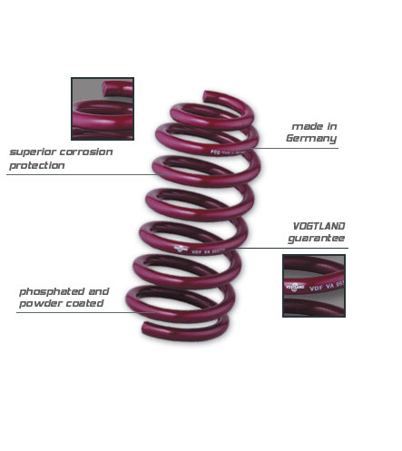 VOGTLAND sport spring sets made in Germany give your car improved dynamic handling, better cornering and a dynamic appearance. This means better appearance with maximum driving comfort in normal operation and sporty, progressive tuning at the operating limits. The special driving dynamics are achieved by the innovative spring design.