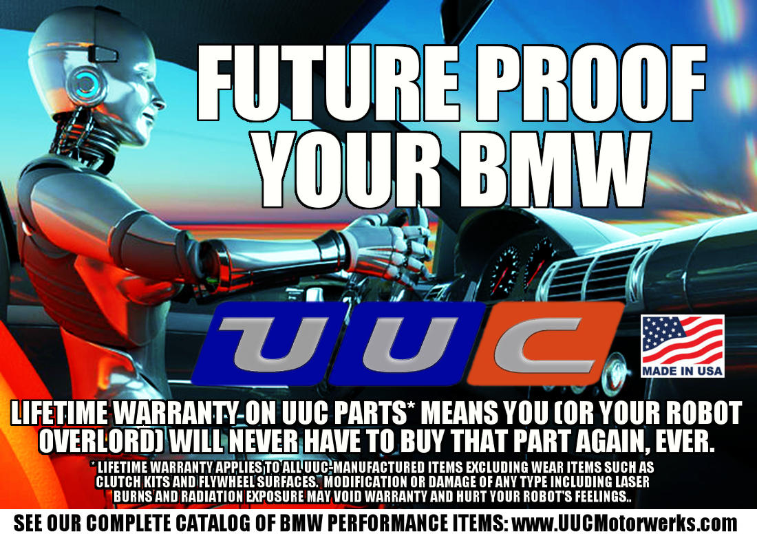 When you buy a UUC item, you should be confident that it will outlast your BMW. This applies to all of our non-wear items as well as many items that other companies might consider wear items, such as bushings. That's right, even our bushings carry our lifetime warranty as long as they are not damaged due to external causes such as accident damage, fire, or laser attack during an alien invasion. Even if you race your car, the UUC products will last.