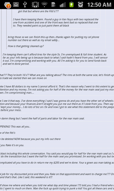 Then every goes back on blast including this whole conversation. You said you would pay for half for the rear main seal so I want that. You have the cash for the wheels I will do the transaction but I want the half for the main seal you promissed. Im working with you but looks like your not.
