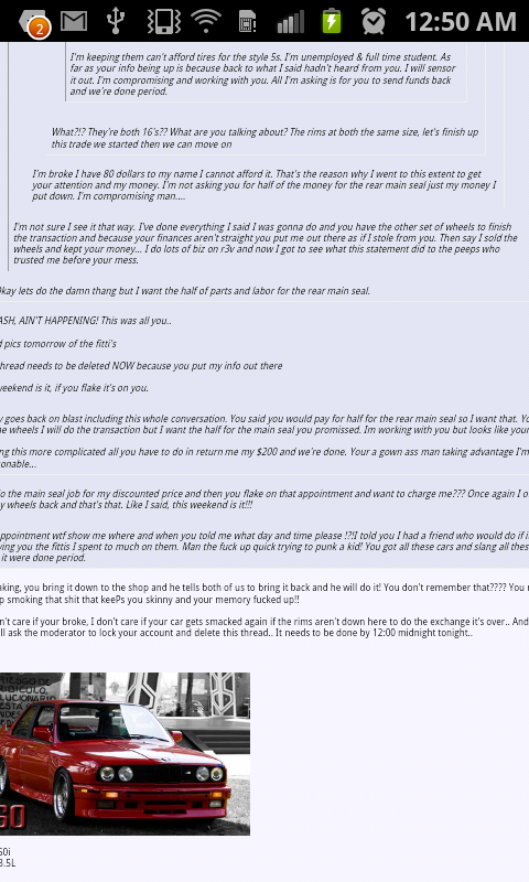 You asked me for these wheels and you partially payed for them, set appointments then flake, tell me your broke and then go buy lowering springs from one of my boys?? "Wreck your car" so I cant get my wheels back then list the car for sale with my stuff on it??? I am finishing what you started and no more excuses on your end.