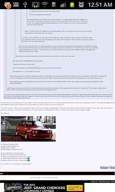 Fourthly in your original post you mentioned having entering into an agreement to purchase the style 5's and paid Jon $200. Everything that happened after that point was you not following through on your end of the deal why should he return your money on something you had given your word? It's not like he promised something and didn't deliver, he still wants to complete the transaction you just need to show up. Additionally you have 16" tires already you can swap them onto the new wheels. I agree the accident put you in quite a pickle as far as this deal went keeping your end of the bargain and probably a financial setback as well. It would be interesting to see a timeline of when Jon had your style 5's ready for pickup vs. when your car was allegedly hit, if you had let an unreasonable amount of time pass this would also be a demerit to your argument. Living 40 miles away is no excuse, thats an evening of your time you act like it is 400 miles and a two day trip. Thousands of people flake on buying things on R3V myself included and this is a classic example of the attitude that perpetuates among many on this forum making it very frustrating to do business on R3V. I think it is fair for Jon to take a stand. I personally had 10 buyers on here say they wanted to buy my Recaros, asked for my paypal and then disappeared into thin air and I had no recourse for them wasting my time. Might I add he is one of the few buyers on R3V that have never ever flaked on me and always showed up on time and with clear communication. If Jon was not responding to you we know you definitely have his address, why not go there.