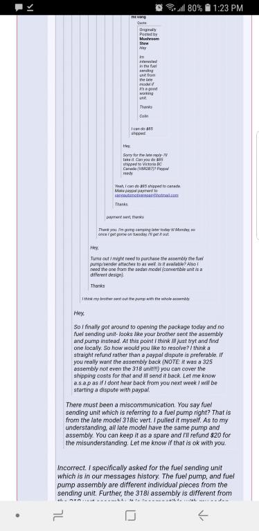 Couple days later, he messaged me again looking for the fuel pump assembly. I told him my brother sent out the fuel pump along with the assembly.