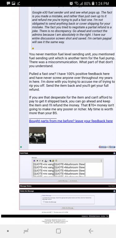 A week later he recieved the package and he messaged me he was looking for a fuel level sending unit and not a fuel pump. I told him I though he wanted a fuel pump. I give him options of what to do, if he doesn't like any of them, I'll gladly refund him his money back. He then messaged me accusing me of trying to scam him. I told him I have 100% feedback here and have never intend to scam anyone. I told him we had a miscommunication about the item.