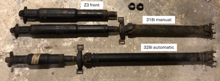 I have a 1986 325 coupe that I swapped with an M50TU and a Getrag 250. I found a Z3 at a junkyard, so I took many parts, including the ZF 320. I also took the front driveshaft, thinking it might be similar to the one in the 328i. I also found a 318i manual and a 328i automatic, and I was surprised by the differences in the rear driveshafts of these two cars. Most forums say that E36s have the same rear driveshaft, but clearly, that's not the case, as you can see in the picture. I took many measurements and was hoping someone could confirm which one is proper for the rear and whether the front section from the Z3 is the same as the 328i manual.
