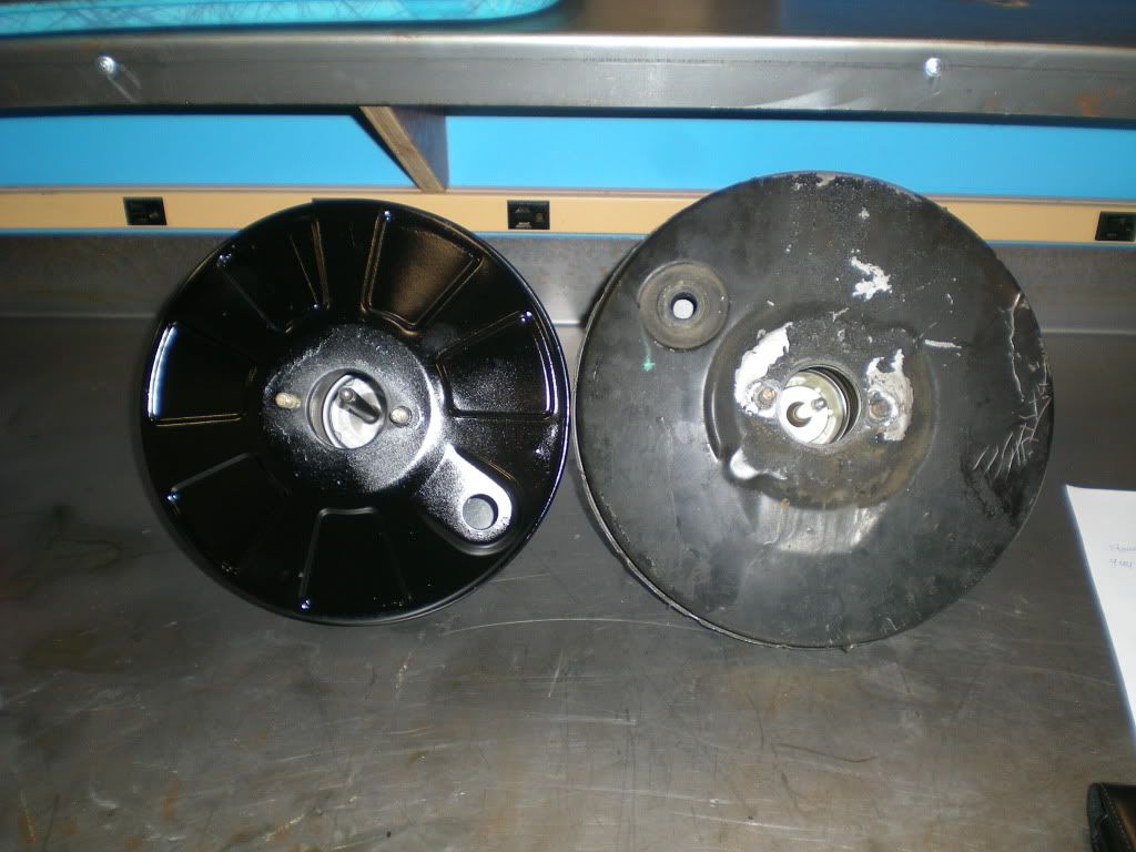 Here is the stock e30 brake booster next to the 944 booster which I sanded and repainted. You can see the size difference.