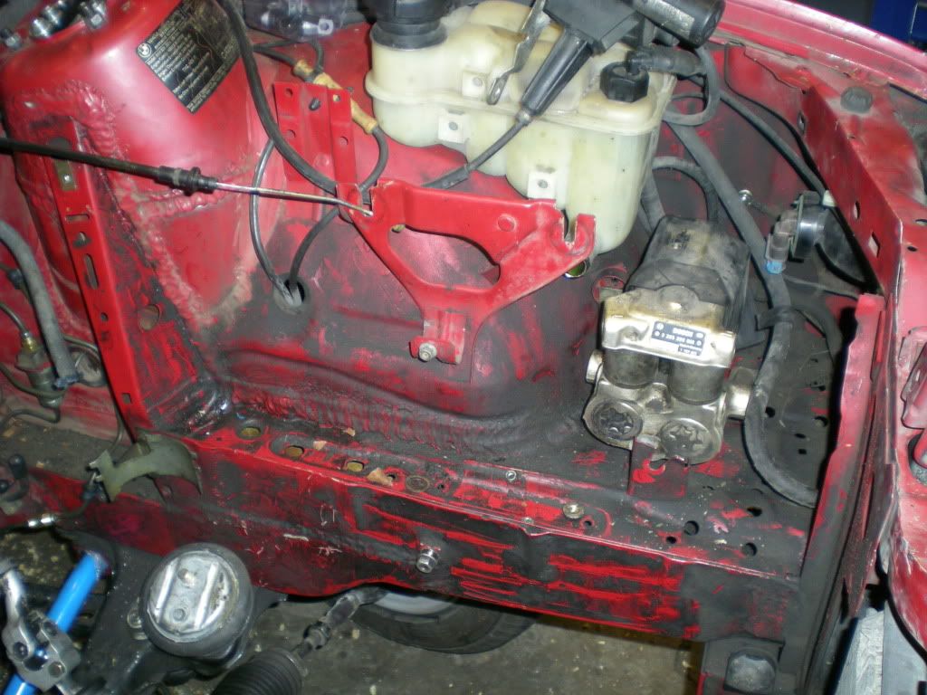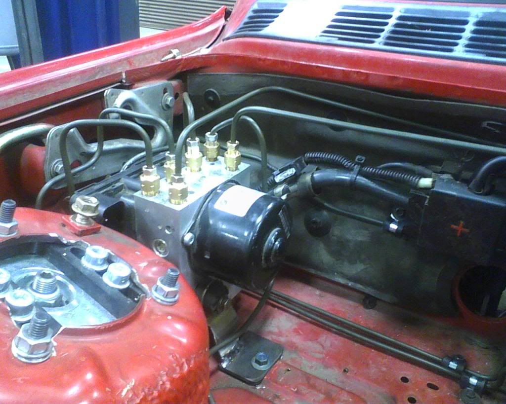 Here is where I mounted the new ABS pump. The reason I mounted it by the firewall is because the e46 intake is bigger and I have a Injen cold air intake that pipes out right where the e30 ABS was mounted. consequently ALL the brakes had to be routed to that side. The lines aren't as good looking as I hoped, but this has been my first time ever bending lines.