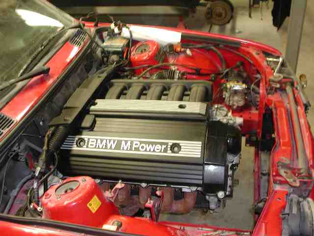 Took a month or so, but that's because I did a lot of other stuff first. Blasted and painted entire E30 M3 suspension with all new bushings and wheel bearings and installed diff too. Had engine on stand for a month or so, prepped and painted the block, new waterpump, al. therm housing, some ltw pullies, some serious wiring harness rehab (cleaned the shit out of it for about two nights straight). Basically I spent a lot of time cleaning and making all these parts look nice. Scrubbed down all the engine covers and manifold too to make it look as new as possible. Skipped a few parts, but I'll get to them later. headers are not staying on, just left them there for now. Lots of other stuff done like 24lb injectors, euro HFM going on the car, ltw flywheel, and lots of other misc crap. 320i brake booster had absolutely ZERO clearance problems with the fins on the S50 manifold. I ground down a fin before the motor went in, but it didn't need it.