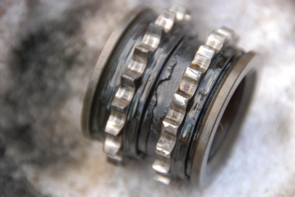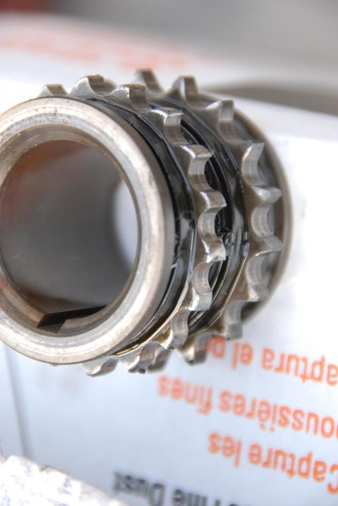 and the crankshaft sprocket is toast. From what I'm guessing is that it had to be worn from a previous failure as well, and somebody cheaped out. The lower chain tensioner rail had only a tiny section of cracked plastic on the top and wear marks on the metal towards the bottom.Comment
