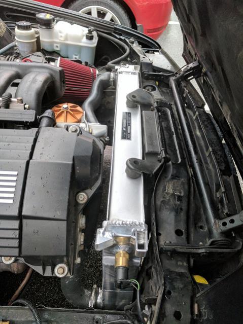 Current rad has a 1.57" thick core, the Z3M mishimoto is 2.4" thick. Space starts to get pretty tight around the waterpump nut but I've got one of those gimicky TMS nuts on the pulley cause they chucked it in an order for free, I can easily save 1/2" there by removing it.