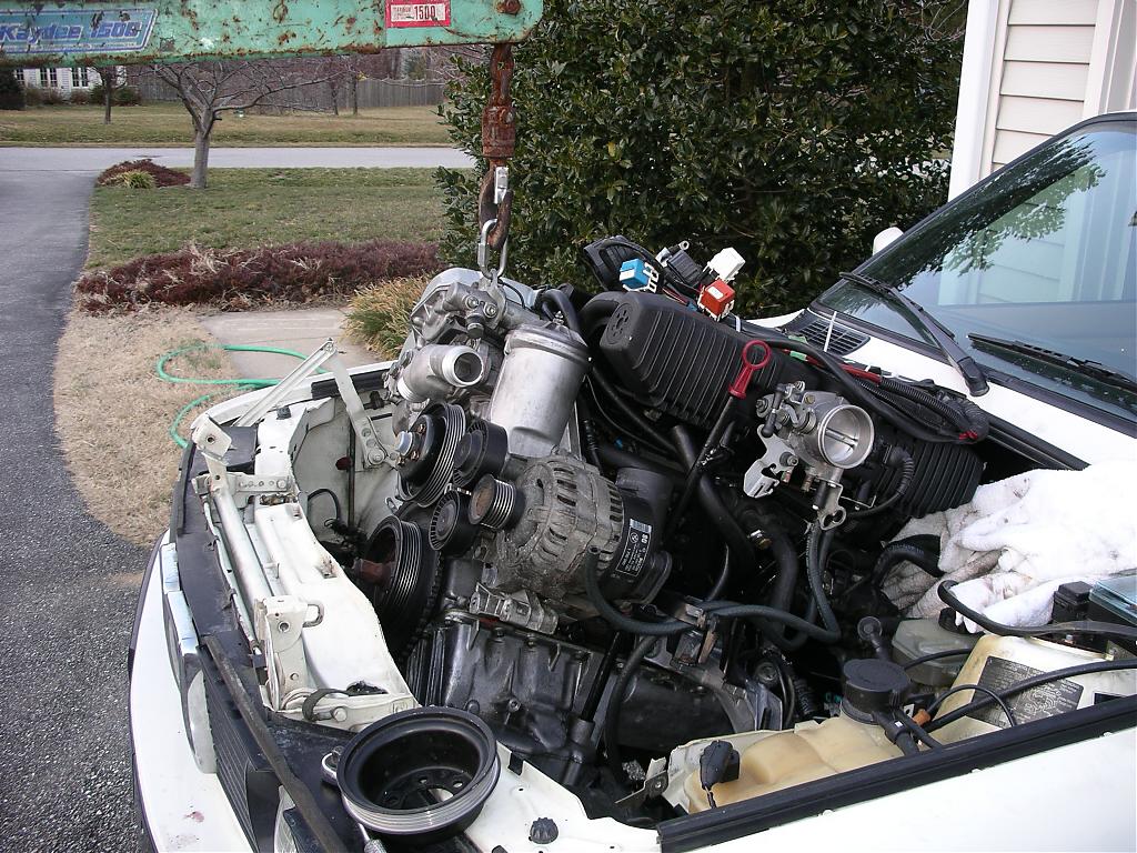 So I started tonight, took me about 4 hours to pull the motor in the cold. No big suprises, except the tranny mounts were torn. Used the patented front-hook-only removal, no sweat (really, because I was freezing!)