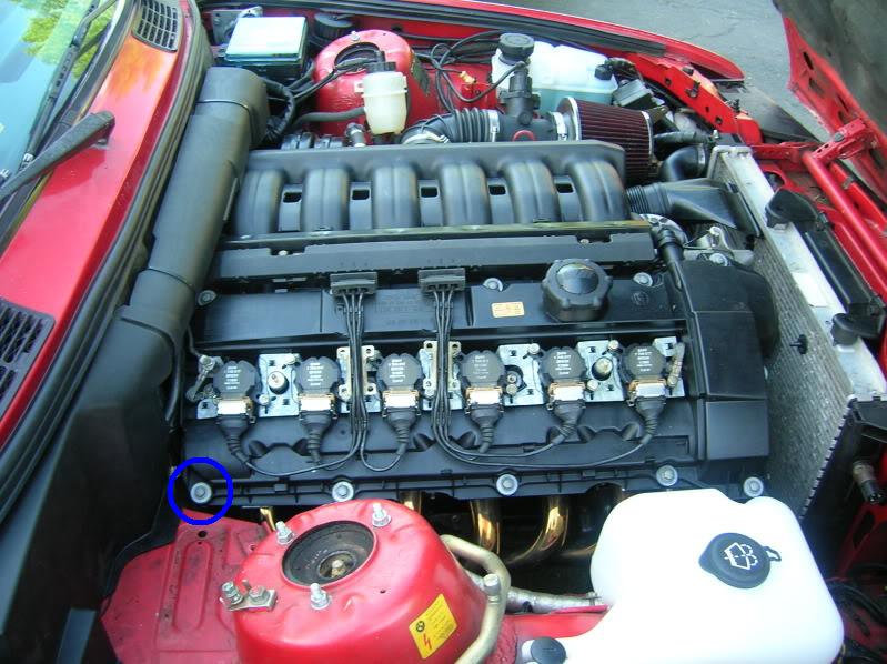 You can also see the two covers on the oil filter housing in this picture, one below and one above the VANOS oil line banjo.
