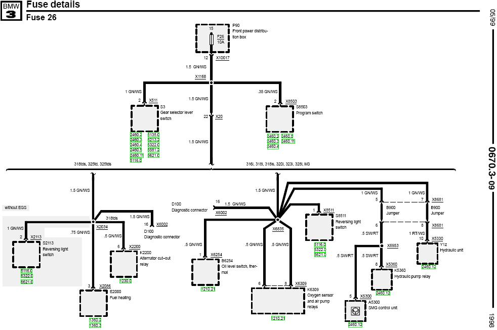 The diagram DaveSmed posted is appropriate for a 98/99 E36. F26 powers a LOT more on the 98/99 E36, including the O2 and air pump relays, in addition to X6002 pin 16.
