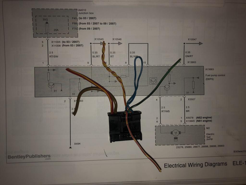 On the off-chance that someone has the Bentley for the Z4 (or there’s a better ETM for e90’s) id love a copy of the EKP diagram. I picked up a 16146766003 module with pigtails and I have an extra wire and the colors on my pigtail are different compared to the e90 diagram. I assume pin 13 is still a k-bus to disable the fuel pump in an accident and can be left floating (it doesn’t need an “I haven’t had an accident” signal) but I also have a mysterious pin 12 which is white with a red stripe and yellow dots.