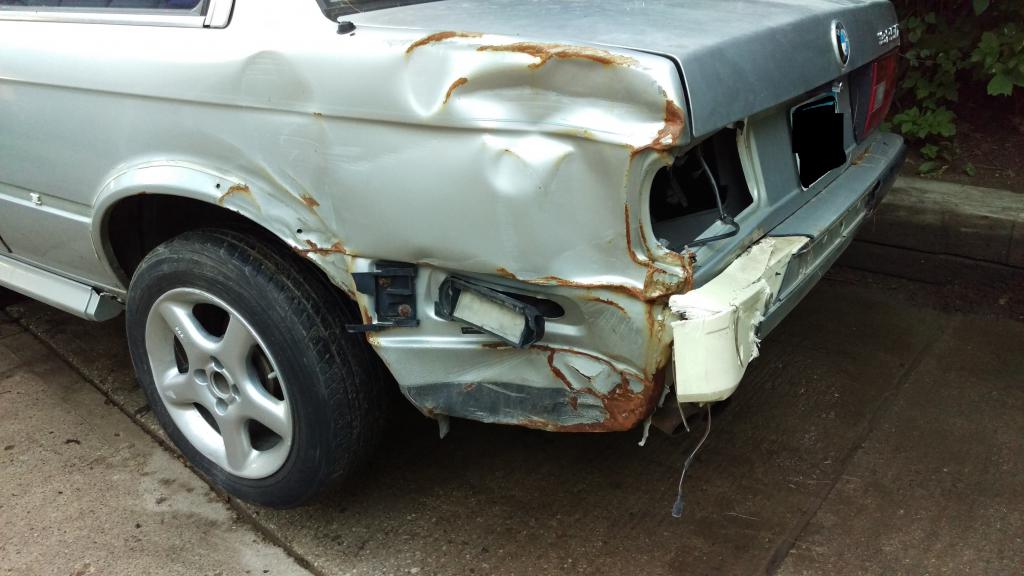 Son lost control on I-80 during a winter snow and slammed rear into guard fence...