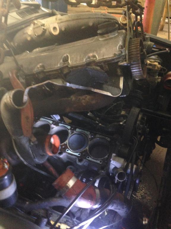 The manifold exhaust to turbo is loose. Removing it to bead blast and coat the parts has been impossible. We have been in contact with Dinan. They will try and help where they can but essentially the told us that back then no real thought was given to future servicing, just to putting out really cool stuff that went. That has translated into...well...needing to pull the head to gain access to the bolts. Some pictures below. It sure has some dirt after 27 years but not for long!